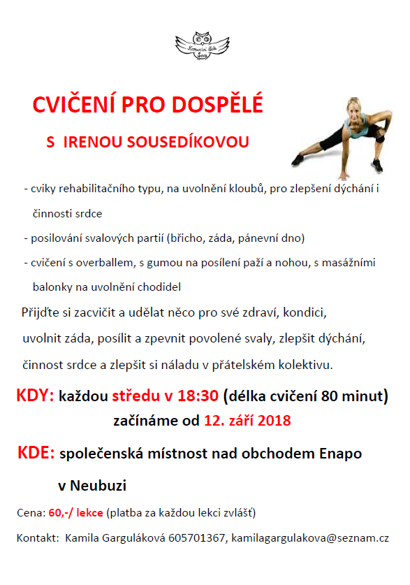 Ve středu 12.9.2018 začínáme opět cvičit s Irčou. Začátek 18:30 ve společenské místnosti nad obchodem ENAPO.