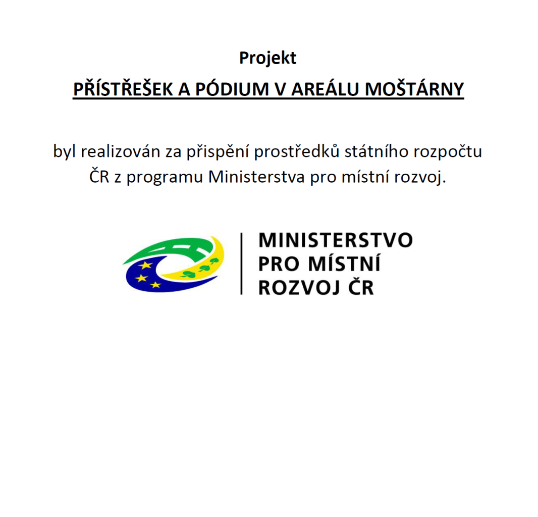 Projekt "Přístřešek a pódium v areálu Moštárny" byl realizován za přispění prostředků státního rozpočtu ČR z programu Ministerstva pro místní rozvoj.