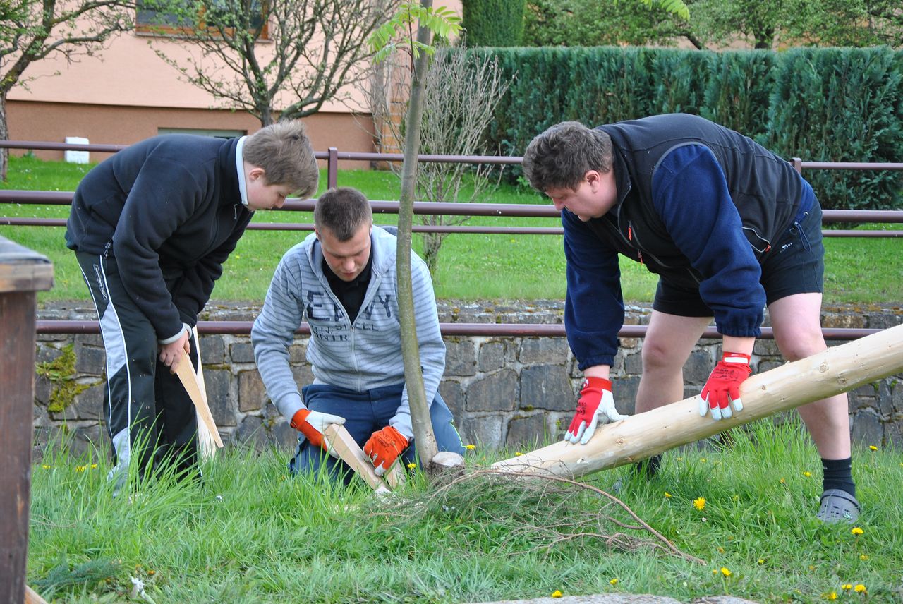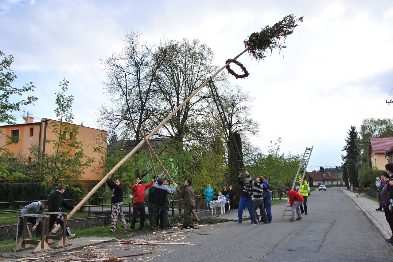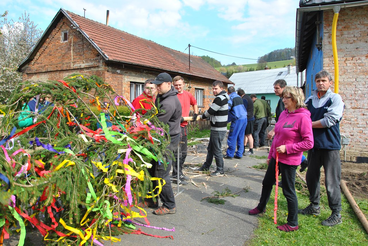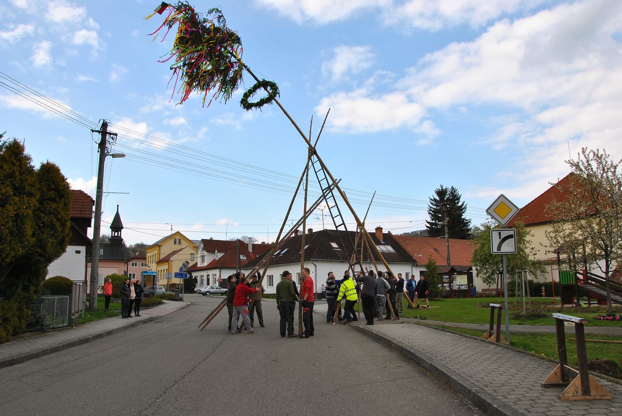 Máje se letos znovu stavil tradičně ručně. Sešlo se nás hodně a zažili jsme spoustu legrace i nervů, aby se vše podařilo. Hlavní máj stojí v parku na návsi, vedlejší jako vždy u Tomšů.